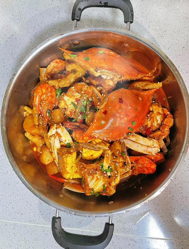 两只大螃蟹+15只虾+8个鸡爪+半根玉米+两个土豆+一个洋葱+小米辣+葱姜蒜+八角桂皮