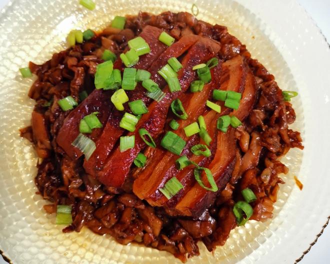 6.肉切片,皮朝下铺在大碗内摆整齐,浇一点调料盘的汁。炒好的梅菜铺肉上面,摁一摁,调料盘内剩下的汁可以都浇上去。